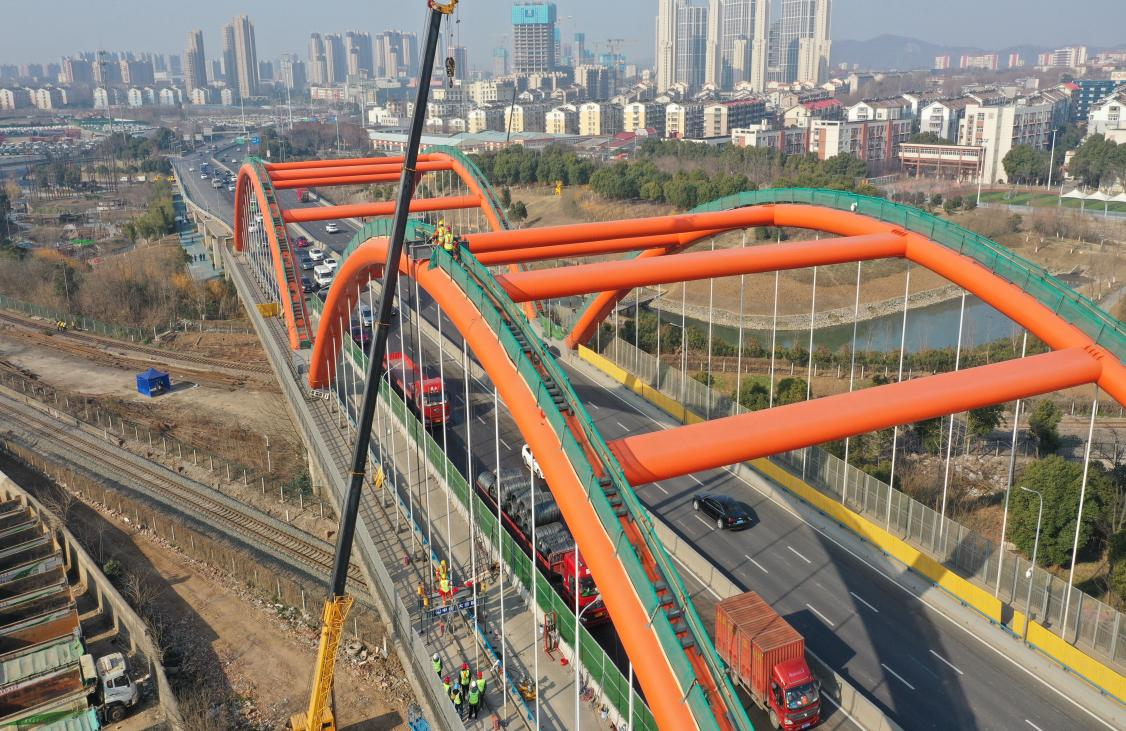 棲霞大橋為城區連接繞城高速主干道上,吊桿更換期間半幅施工,仍然保證6車道通行;且上跨鐵路,13跨橋梁上跨二七油庫線,梁底距離鐵路軌道頂面的間距約為6.8m,14跨橋梁上跨堯興支線鐵路,橋梁梁底距離鐵路軌道頂面的間距約為6.9m,15跨橋梁上口市政道路燕堯路,梁底距離路面的高度為6.09m。